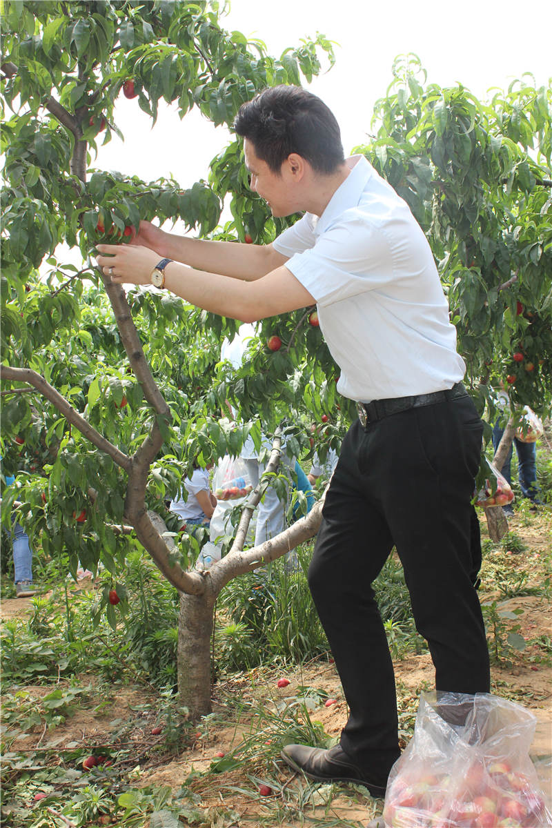 片刻休整后,采摘活動正式開始。大片的油桃樹,上邊掛著青的、黃的、紅的,大的、小的各種油桃,讓人垂涎欲滴。大家來不及裝進袋子,等活動結束再吃,都迫不及待的摘下來,或簡單擦拭、或用少量礦泉水簡單清洗,馬上就開伙,連黃總:吃多了拉肚子的警告都當了耳旁風。
